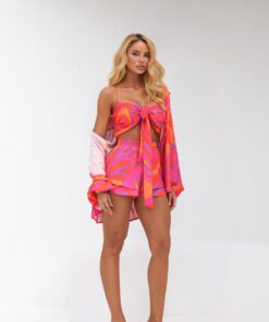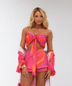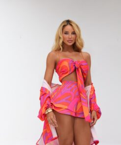 Confeccionado em crepe de alfaiataria, o look traz cropped com laço frontal e shorts de caimento fluido, garantindo conforto e um toque moderno ao visual.