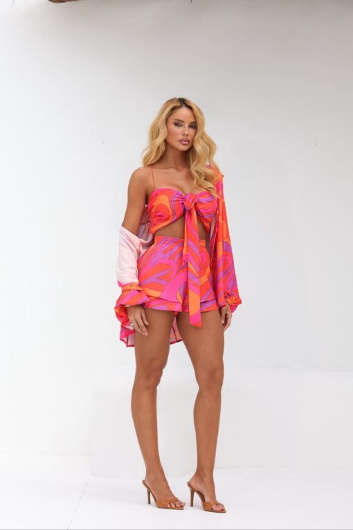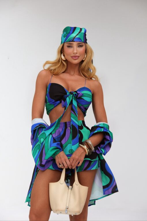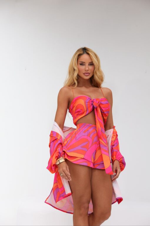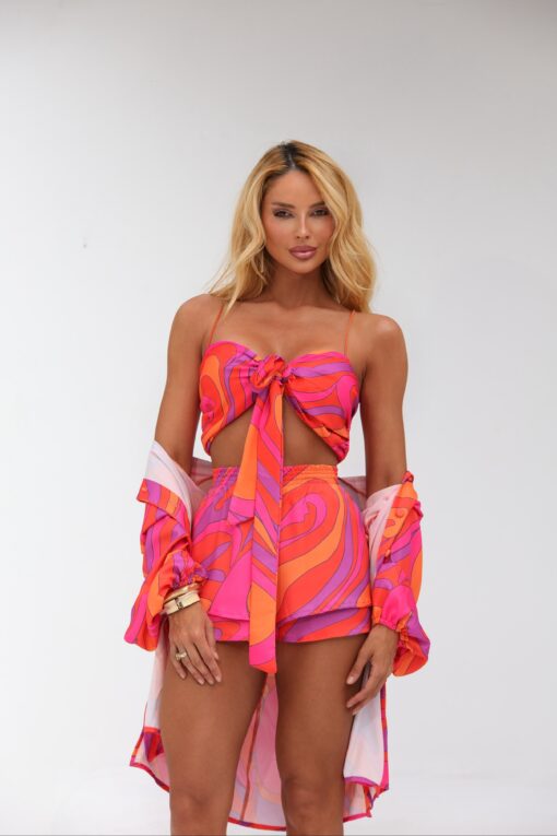 Confeccionado em crepe de alfaiataria, o look traz cropped com laço frontal e shorts de caimento fluido, garantindo conforto e um toque moderno ao visual.