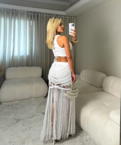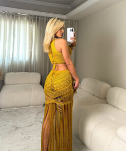 O Conjunto Bali é a tradução perfeita do luxo handmade. Produzido em fio Rayon com franjas em seda, ele une leveza, fluidez e sensualidade na medida certa. O top ajustado valoriza a silhueta enquanto a saia longa com recortes estratégicos e franjas proporciona um movimento hipnotizante a cada passo.