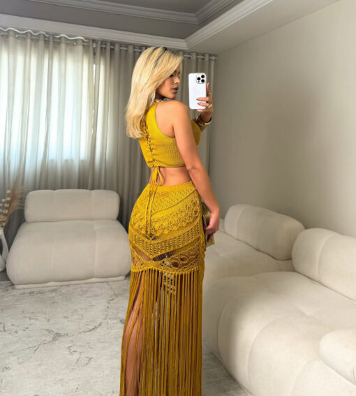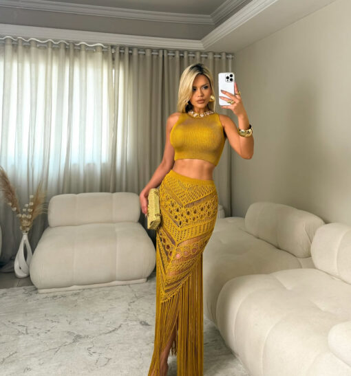 O Conjunto Bali é a tradução perfeita do luxo handmade. Produzido em fio Rayon com franjas em seda, ele une leveza, fluidez e sensualidade na medida certa. O top ajustado valoriza a silhueta enquanto a saia longa com recortes estratégicos e franjas proporciona um movimento hipnotizante a cada passo.
