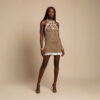 A calcinha fixa no estilo asa delta complementa o conjunto. Acompanha uma saia de crochet, com fechamento em zíper invisível, barrada com franjas feitas à mão, adicionando um toque de charme artesanal.