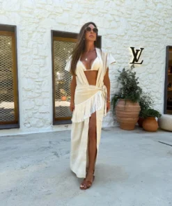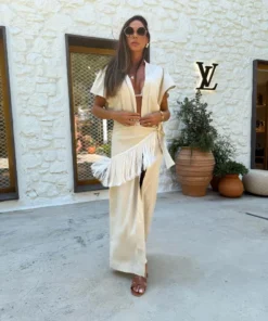 O poncho possui manga curta e é aberto na parte frontal. Contém uma saia avulsa de amarração com franjas hand-made que pode ser usada sozinha ou sobreposto ao poncho, que garante um look assimétrico, sofisticado e fashionista.