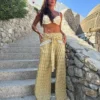 Conjunto de biquíni confeccionado em malha trilobal na cor champagne, poncho e amarração de franjas.
