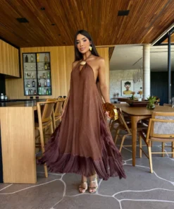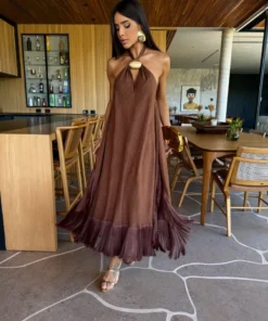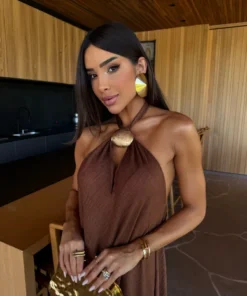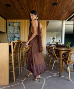 Vestido midi alongado confeccionado em tecido creponado na cor marrom, com um design elegante.