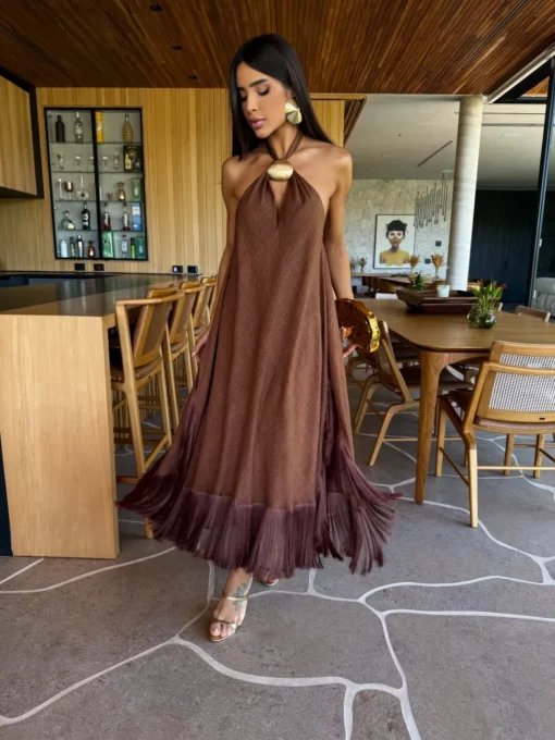 Vestido midi alongado confeccionado em tecido creponado na cor marrom, com um design elegante.