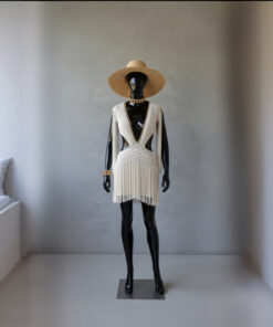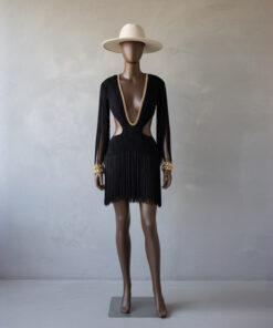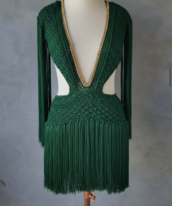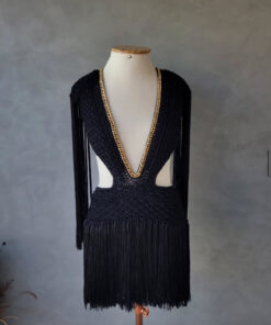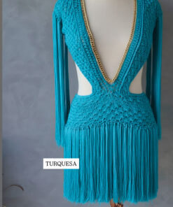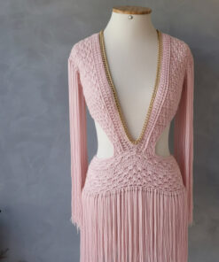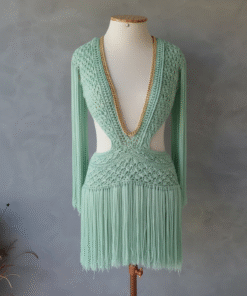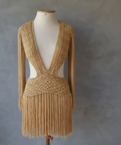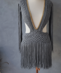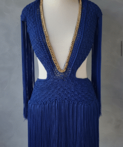 Um verdadeiro espetáculo artesanal, o Vestido Aruba foi desenvolvido em crochê manual no sofisticado fio de seda, unindo elegância, sensualidade e exclusividade. O decote profundo emoldurado por corrente dourada traz modernidade e sofisticação, enquanto as franjas longas em movimento garantem um visual marcante e cheio de personalidade.