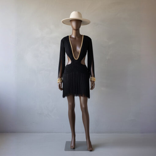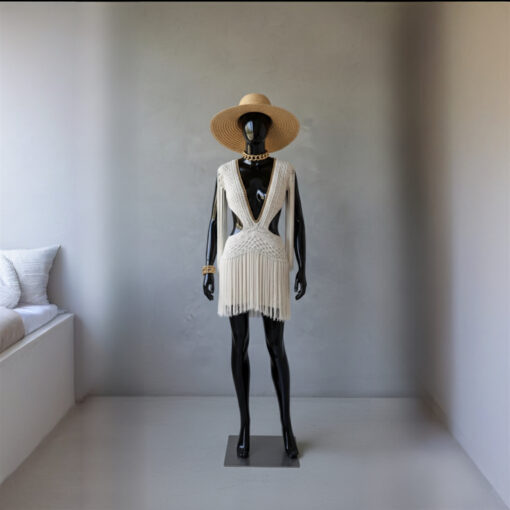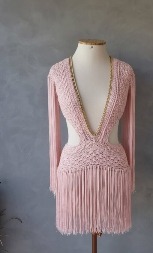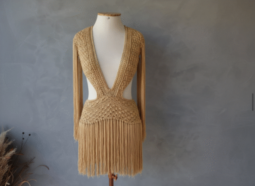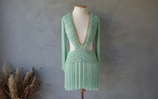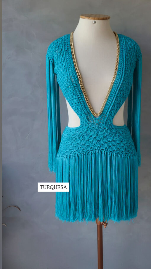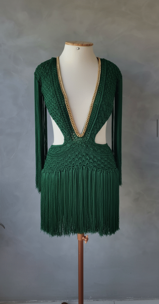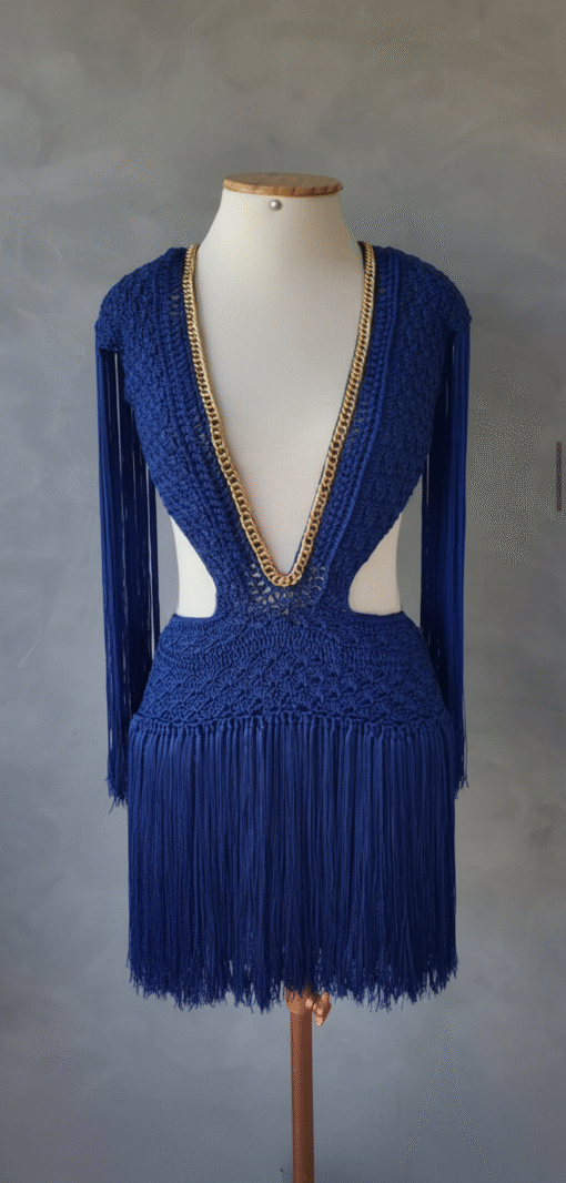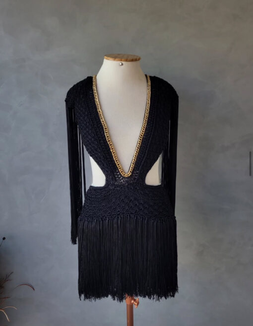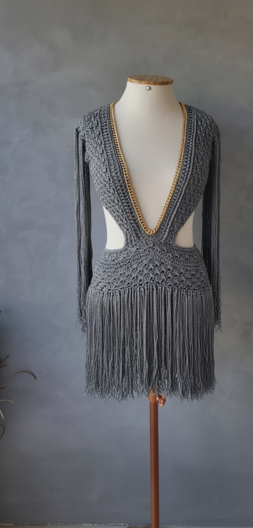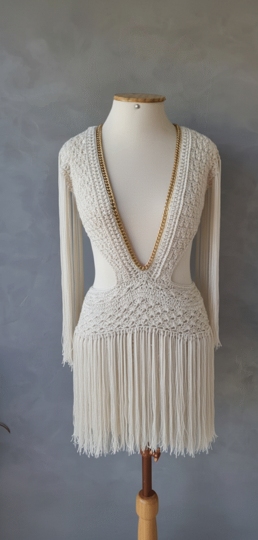 Um verdadeiro espetáculo artesanal, o Vestido Aruba foi desenvolvido em crochê manual no sofisticado fio de seda, unindo elegância, sensualidade e exclusividade. O decote profundo emoldurado por corrente dourada traz modernidade e sofisticação, enquanto as franjas longas em movimento garantem um visual marcante e cheio de personalidade.