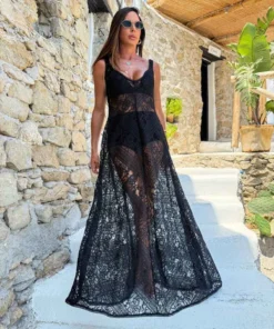 Vestido longo confeccionado com renda vazada preta com detalhes em guipir no decote.