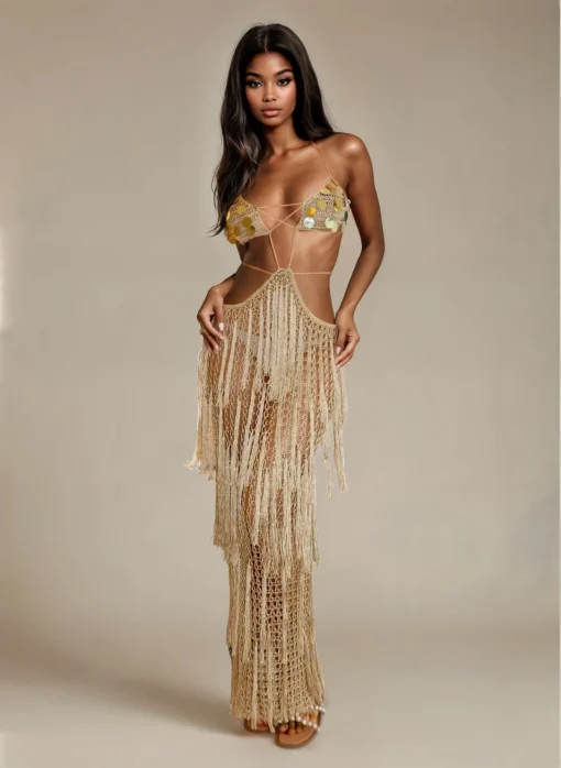 O destaque fica por conta do busto adornado com paetês dourados, que adiciona brilho na medida certa e garante um visual glamouroso para ocasiões especiais. A modelagem longa com recortes estratégicos e franjas alongadas cria uma silhueta poderosa, moderna e sensual, perfeita para quem gosta de marcar presença.